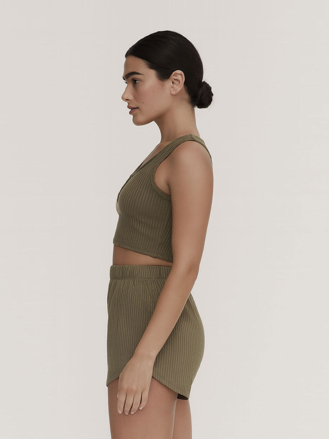 Breeze through your day in this effortlessly chic olive green co-ord set. The sleeveless tank top features a scoop neckline with a buttoned placket for subtle detail, while the high-waisted shorts offer comfort with an elasticated waistband and soft curved hem. Crafted from breathable cotton blend fabric, this lightweight set is your go-to for sunny strolls, workouts, lounging, or casual outings.