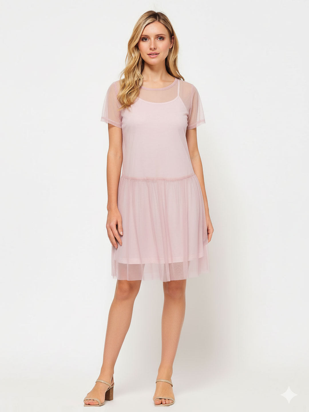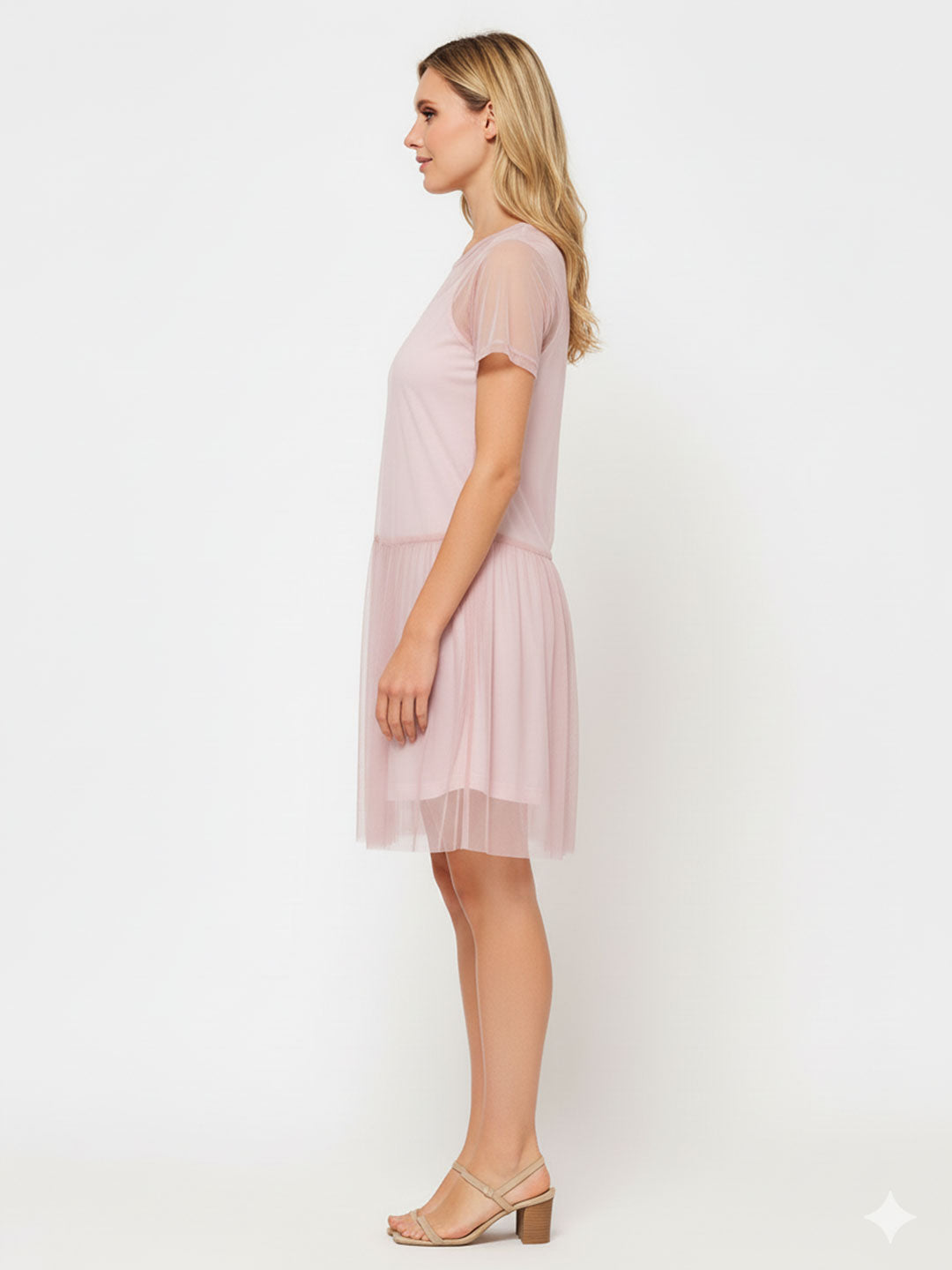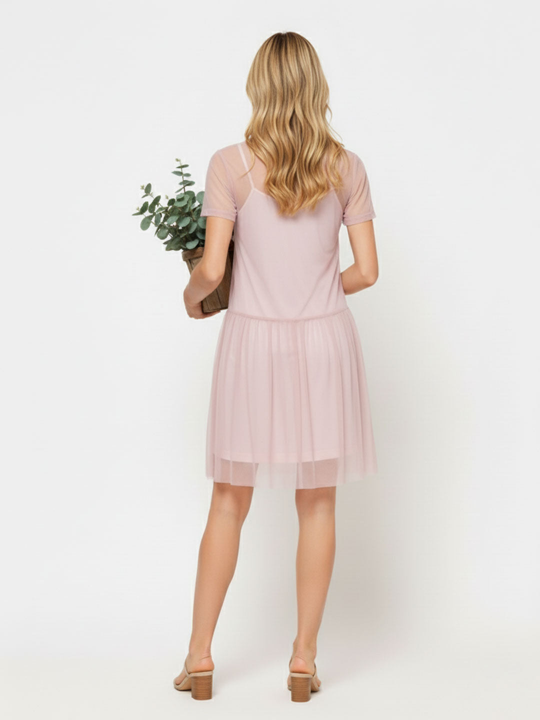 Grace meets playfulness in this blush pink skater dress featuring soft mesh panels and a dreamy silhouette. Designed with a double-layered bodice a sleeveless inner slip and sheer mesh yoke and sleeves it brings a romantic twist to a classic fit-and-flare shape. The gathered mesh overlay on the skirt adds subtle volume and movement, perfect for brunch dates, birthday celebrations, or casual evening looks.