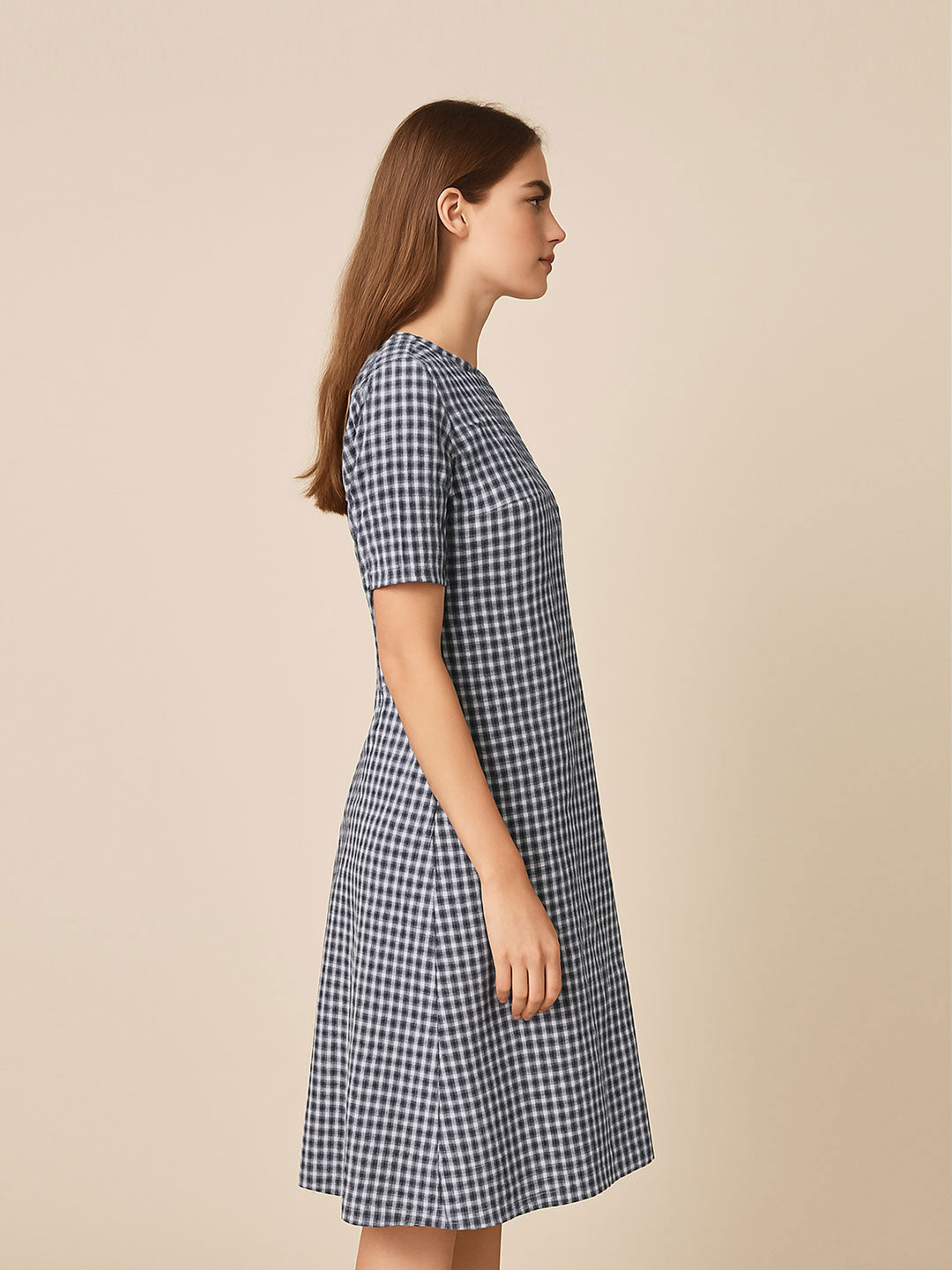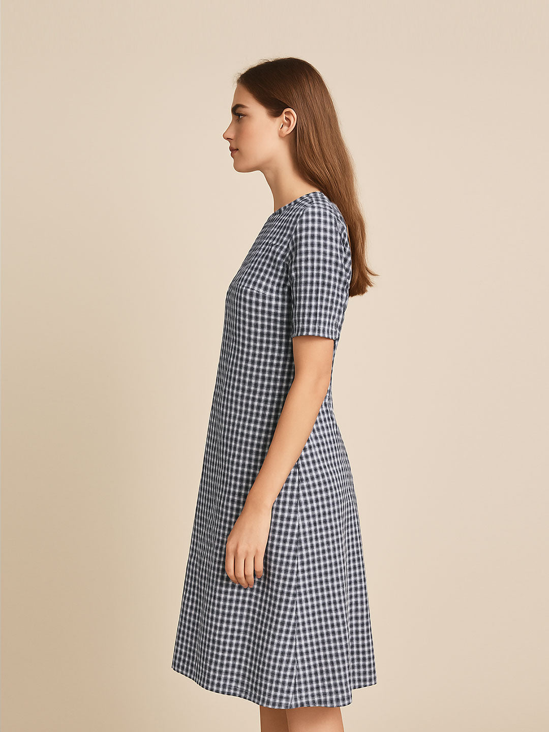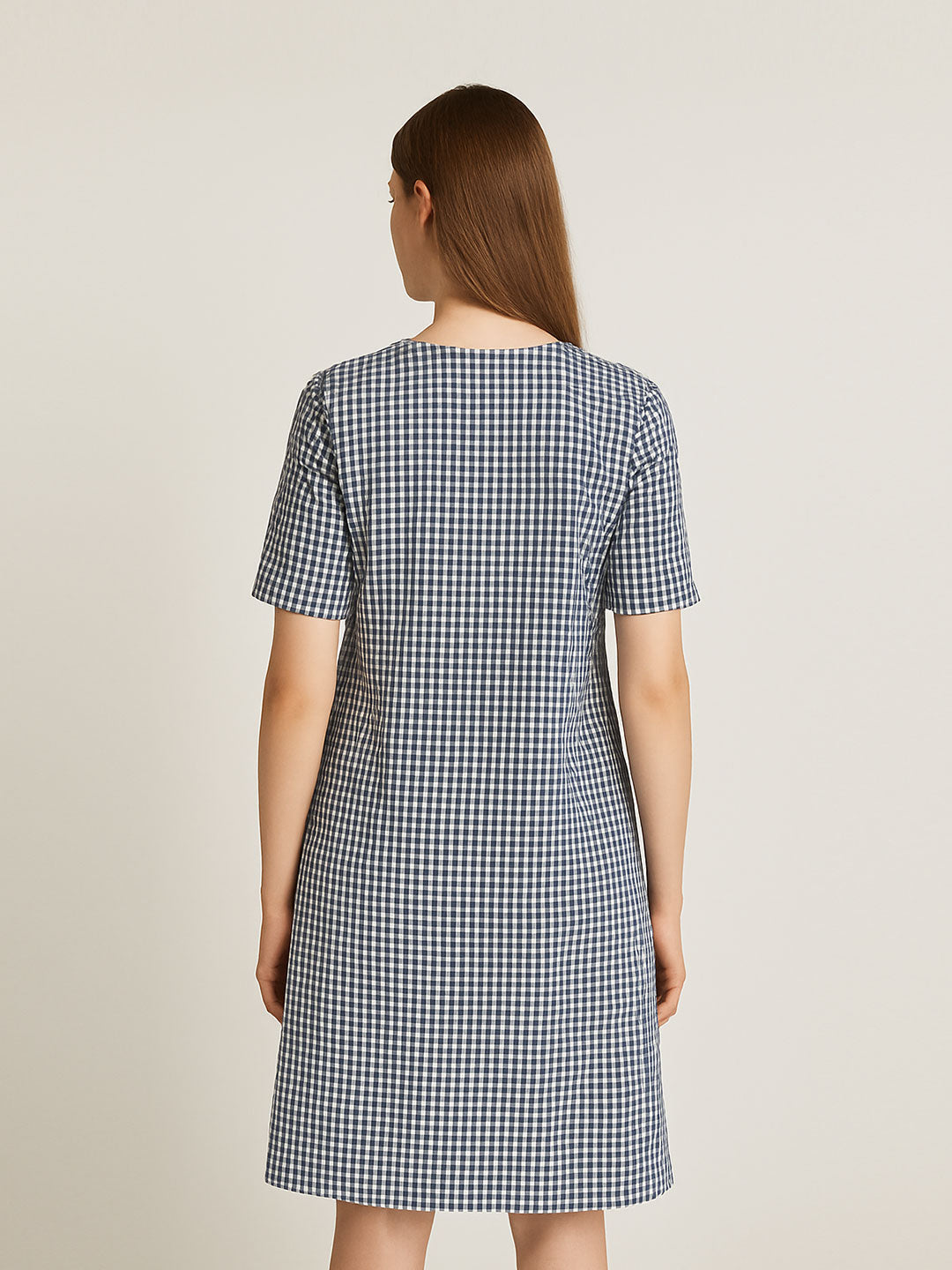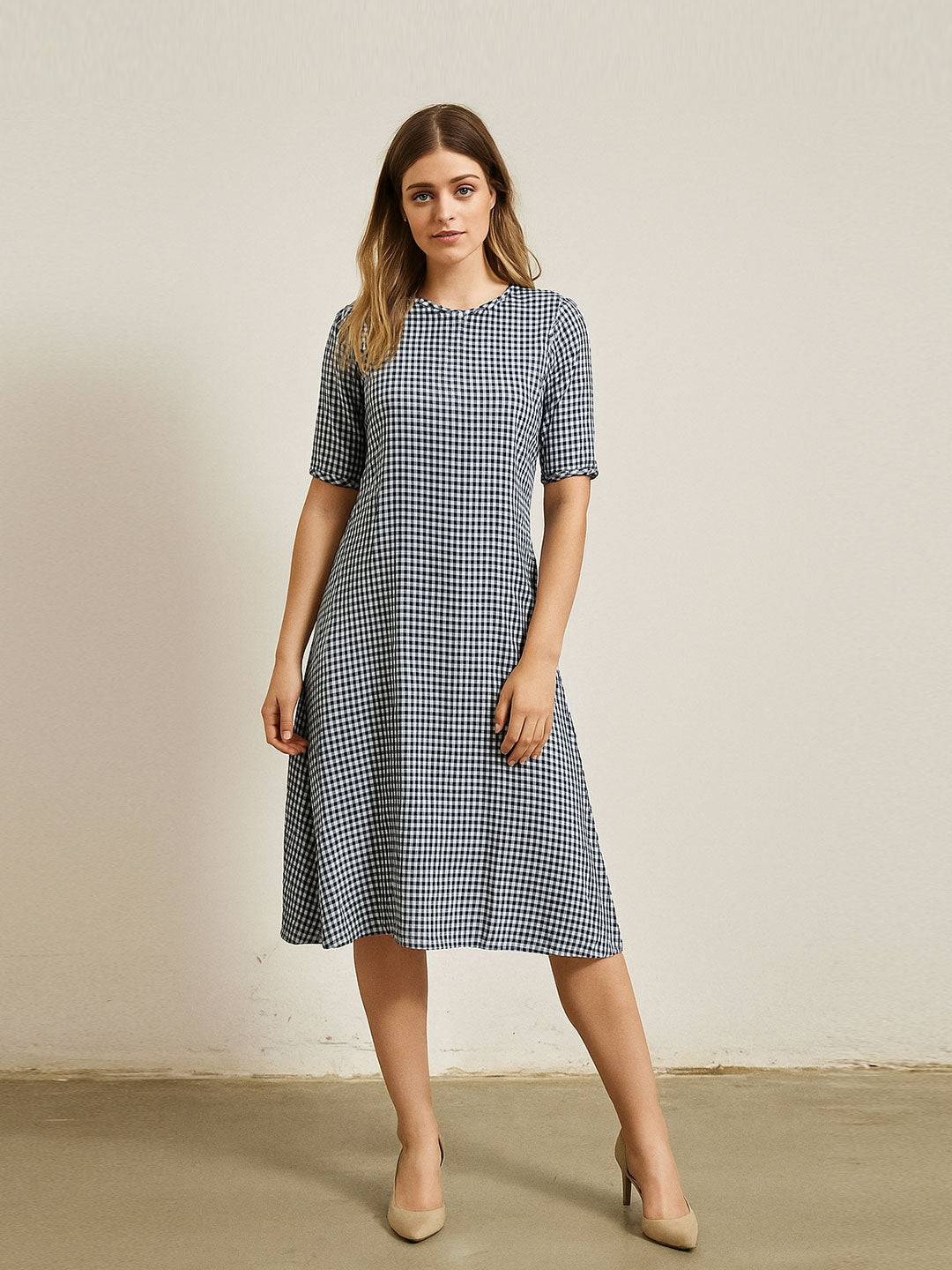 Add timeless charm to your everyday wardrobe with this navy and white gingham midi dress. Featuring a classic round neckline, half sleeves, and a gentle A-line silhouette, this dress offers both comfort and polish. The lightweight fabric drapes beautifully and ensures breathability, making it ideal for warm days, office settings, or casual brunches. Effortlessly chic, this piece is a versatile essential.